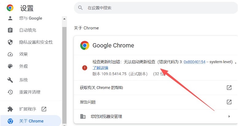 点击菜单左下方的“关于Chrome”,可以发现浏览器页面会显示“检查更新时出错:无法启动更新检查”,说明脚本执行成功!
