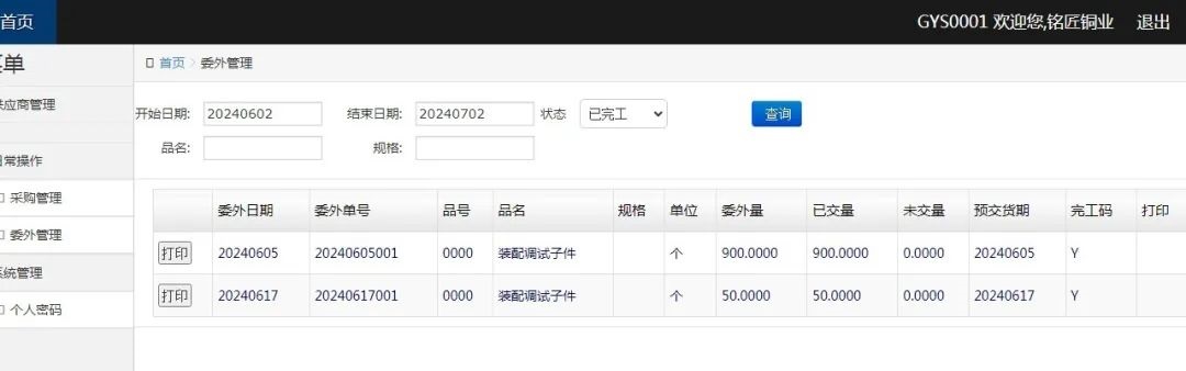 4、打开委外管理界面,显示未交委外信息,如需要交货可以同步打印二维码标签等,后续将会加入根据未交委外单生成未审核的委外进货单
