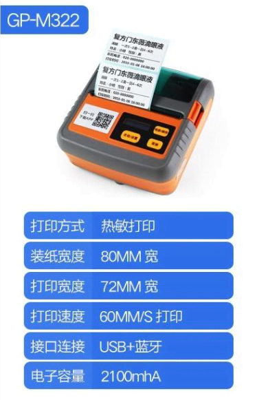 佳博GP-M322 佳博GP-M322是一款便携式热敏标签打印机,广泛应用于商业场景如零售、仓储、物流等,支持无线连接和多种打印任务。 主要特点打印性能:采用热敏打印方式,打印宽度最大72mm,打印速度可达80mm/s(票据模式),分辨率为203DPI。支持一维和二维条码(如CODE128、QR CODE),并可放大或旋转字符。 连接与兼容性:配备USB和蓝牙接口(部分版本支持WiFi),可连接电脑、手机或平板,实现无线打印。内置2100mAh电池,支持移动使用。 设计与便携性:机身尺寸约126×109×61mm,重量410g(不含纸卷),结构紧凑,便于携带。支持热敏卷筒纸和不干胶纸,介质幅宽25-80mm。 适用场景适用于超市价签、服装吊牌、物流面单、仓储标签等场景,尤其适合需要移动打印的场合。 更多图片