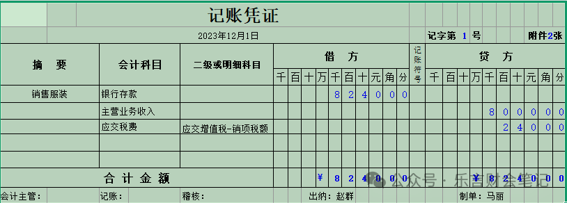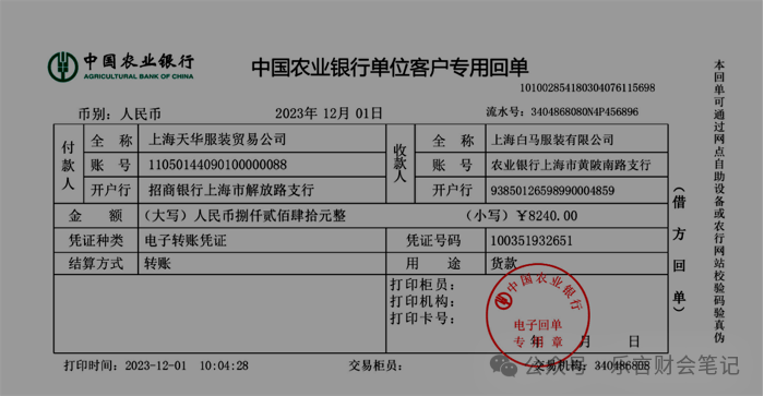 12月1日,服装公司(小规模纳税人)销售给上海天华服装贸易公司服装一批,价税合计数为8240元,对方转账支付了货款,出纳已从银行营业厅打印出银行到款回单。
