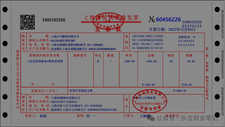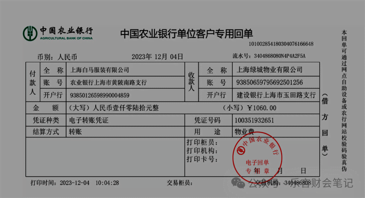 12月4日公司转账支付办公室11月份物业费1060元。