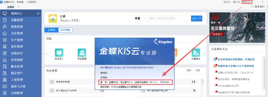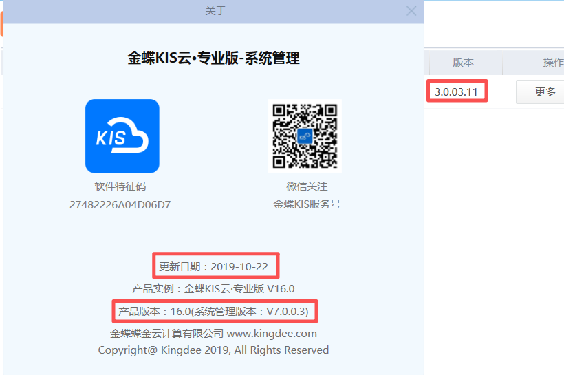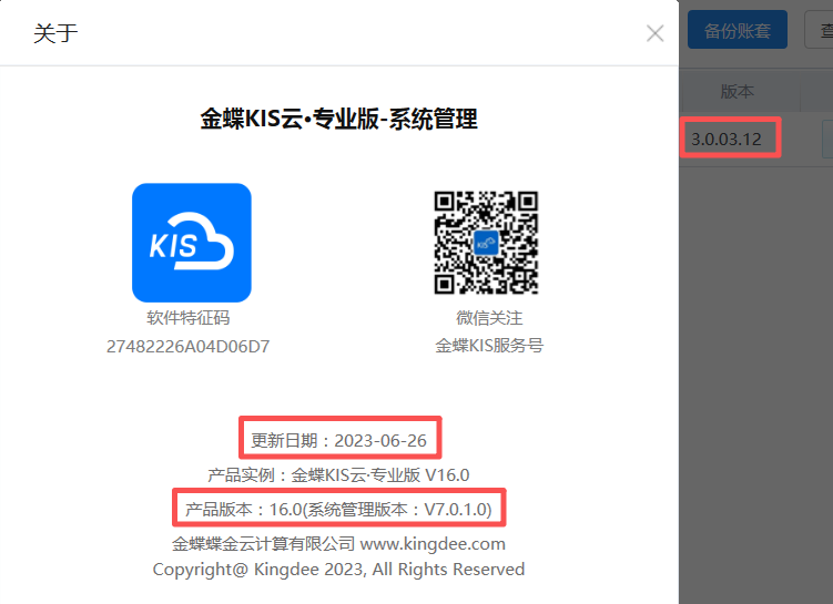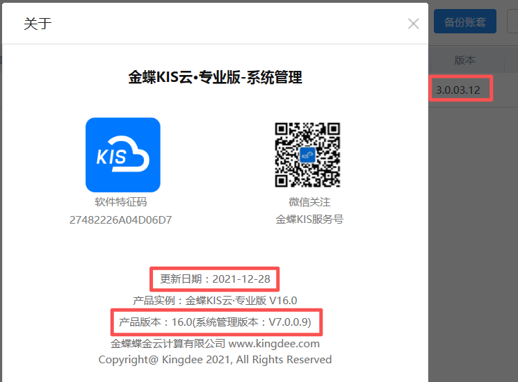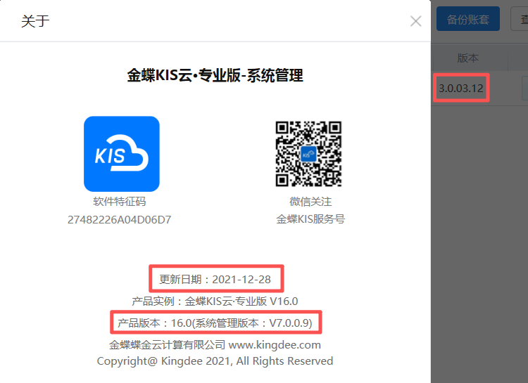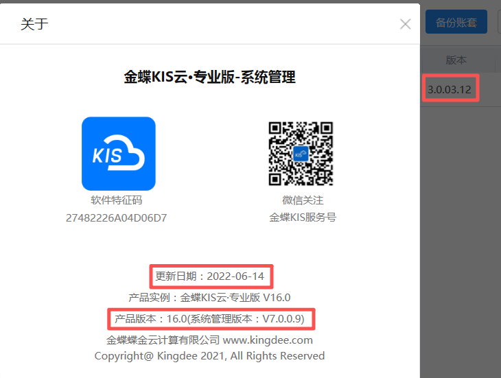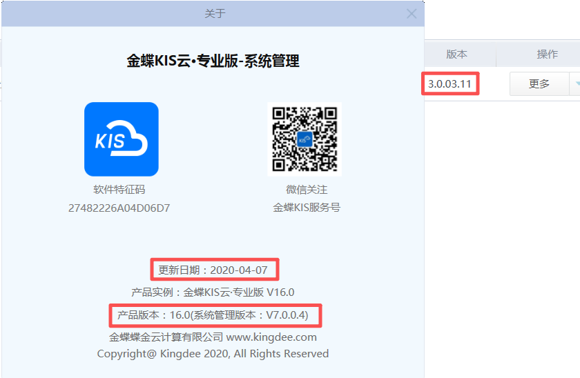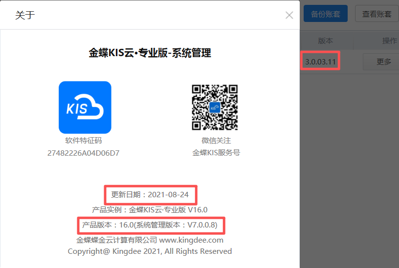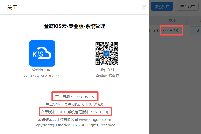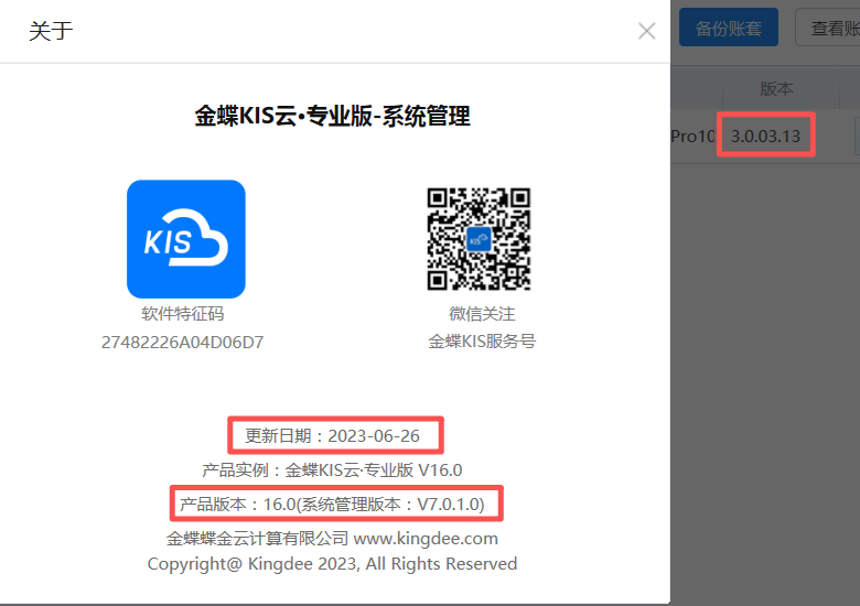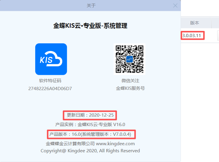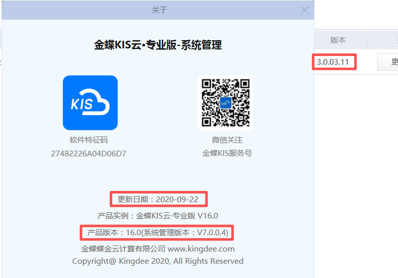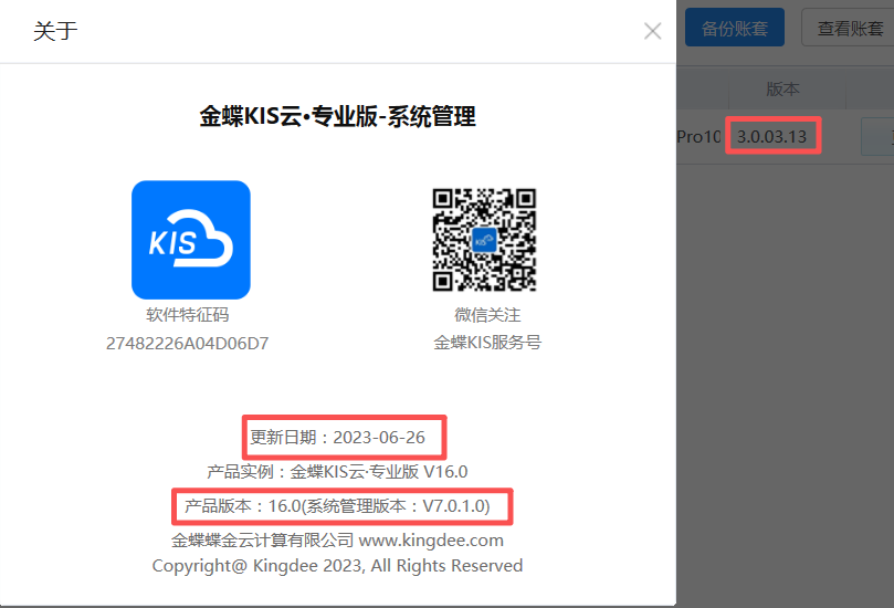 三、金蝶KIS云·专业版V16.0更新日期及版本号