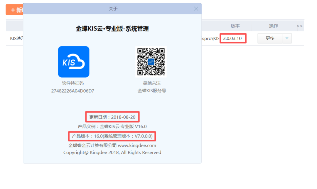 金蝶KIS云·专业版V16.0第一个安装包安装以后系统管理界面显示的更新日期2018-08-20,系统管理版本为V7.0.0.0,账套版本号3.0.03.10,如下图所示: