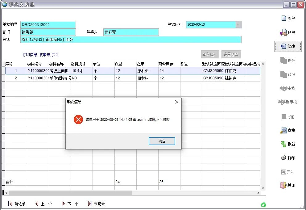 结账后修改单据会得到如下提示