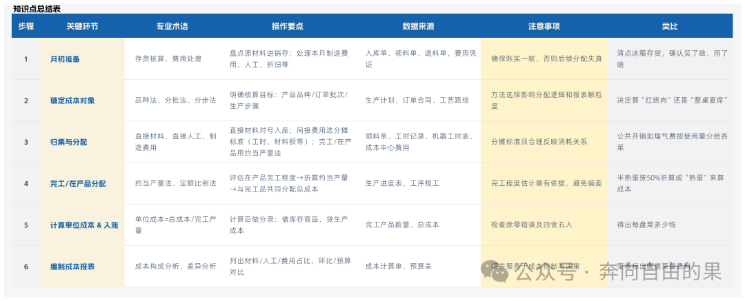 如果你觉得成本核算听起来好像特别头疼,一堆数据和各个步骤又绕来绕去。那也不要慌,咱们今天就手把手带你走一遍成本核算的一个完整的流程。 如果我们把成本核算想象成给厨房做算一笔总账。那就是今天我们做了多少菜,也就是产品。用了多少肉和菜,也就是这个材料。同时请了多少厨师和服务员,也就是人工。开了多少的灯,还用了多少的煤气,就是我们的制造费用等等。最后算出来每一道菜到底花了多少钱,算账的过程其实就是成本核算。 ![]() 第一步:月初准备——盘清家底,理清账单咱们接下来就可以按照时间顺序,我们一步一步的进行一个拆解。 第一步就是我们月初的一个准备,要盘清家底,数据一定要齐全。 这个就像大厨做饭一样,我们得提前要清点一下我们冰箱。成本会计在每个月初通常也在1号到4号左右,要做的第一件事情,是要确保所有的数据都到位了。 我们首先就是要盘清粮仓,也就是存货的一个核算,主要的任务就是要搞清这个月所有的材料进出存:我们原材料买了多少,我们领用了多少,车间有没有把用完的给退回来。 为什么要这么做? 首先是如果连仓库实际用了这些材料都算不清楚,后面的成本分配全都是空中楼阁。这就好比你连用了多少斤肉你都不知道,你怎么去算出每盘红烧肉的成本呢? 这里的一个关键动作就是要确保所有的材料的入库单、领料单,还有退料单都要处理完毕,系统里的存货数量是准确的, 其次我们就要理清账单了,也就是费用的处理。 我们除了材料,厨房运营还有一堆杂费,像水电的燃气费,也就是制造费用,还有厨师的工资,也就是直接人工,还有厨房的一些设备折旧,也就是我们设备折旧摊销等等。 我们要怎么做,要把这些当月的实际发生或者应该承担的一个费用,该付款的记账,该计提的要计提,该分摊的全部都要分摊,只有财务账做的全这个数据,这部分数据其实就是现成的。 简单的来说,我们第一步就是把本月所有花出去的钱和用掉的东西要按类别整理好,等着往产品身上贴标签。 第二步:明确对象——确定成本核算目标接下来我们进入第二步,要确定我们算谁的成本,要找到成本的对象,像这种数据已经准备好了,接下来就是要明确我们这个是要给谁算的,也就是成本的对象,我们可以根据企业生产特点的一些不同,算账的目标其实也是不同的。 如果你的公司像包子铺一样,那就要用品种法,产品的种类少,大批量的生产这些成本的对象就是产品的品种,比如说猪肉、大葱包、三鲜包等等,这个月总共做了多少个包子,就算这批包子的总成本和单个的成本 如果你的公司就像一个造船厂,那就要用分批法了,接下来都是大项目,那一艘船肯定都是一个订单,成本对象就是产品的批,比如说订单号,A001-远洋号货轮等等,这艘船的所有的花费就要单独的去核算。 如果你的公司像一个纺织厂,这个就要分步法生产经过多少个车间,比如先纺纱再织布,最后染色,成本对象就是每个生产的步骤,要先算纱的成本,其次再算布的成本,最后要算成品的成本,一步一步的结转下来。 所以在开始分配之前,必须要明确我这个月要核算的到底是哪些产品,哪些批次或者哪些生产步骤的成本。 ![]() 第三步:归集分配——将开销贴到产品上接下来我们进入了核心的一个算账,要把开销贴到对应的产品上面,这个其实就是最核心的一步了,是把第一步准备好的料工费,按照一定的规则分配到第二步我们确定的成本对象上面了,这个过程就是归集和分配。 首先我们要直接材料要对号入座,能明确哪种产品直接用的材料,比如说我们蛋糕用的鸡蛋和面粉就直接记到蛋糕的成本里面,这个就是比较简单,领料单上面通常都会有对应的信息 其次有间接费用,我们找个法子去分摊,比较麻烦的是那些没有直接对号入座的公共开销,比如说车间的照明电费,还有管理人员的工资以及设备的折旧,这些就需要找一个非常合理的尺子来分摊。 常规的尺子有哪些呢? 可以按照各个产品消耗的机械工时,还有人工工时,或者按照直接材料的金额比例来分。 比如说我a产品本月用了100个机器小时,b产品用了50个小时,那么这个电费就可以按照2:1的一个比例分摊给a和b了 最后我们处理半成品,也就是完工产品和在产品成本的一个分配。 我们月底了肯定有些产品已经做完了,还有一些就躺在生产线上了,在产品归集来的总成本就得在它俩之间再分一次。 这种常用的方法就是约当产量法,评估一下产品的完工程度,比如说完成了50%,把它折算成相当于多少件完成的产品,然后再一起参与分配,这样才算公平。 上面这些过程在ERP的系统里面,通常体现为一系列的确认和核算的步骤,像确认成本项目,核对数据,确认核算层级等等。 比如说我们先算一车间的,再算二车间的,然后在系统会自动的或辅助完成对应的核算。 ![]() 第四步:结果产出——计算、入账与报告那么接下来进入第四步,也就是出结果和入账了,这个就可以算出单价变成一个完整的闭环。 像我们上面经过一番分配,我们终于得到结果了,首先我们要计算单位成本,用某个成本对象的一个总成本去除,以它的一个完工数量,就可以得到我们非常宝贵的单位成本了,后续的定价分析利润的一个基础了。 这个公式其实很简单,单位成本=总成本/完工产量 其次就是产成品入库,根据算出来的成本,要做一笔非常重要的会计分录的入账 借:库存