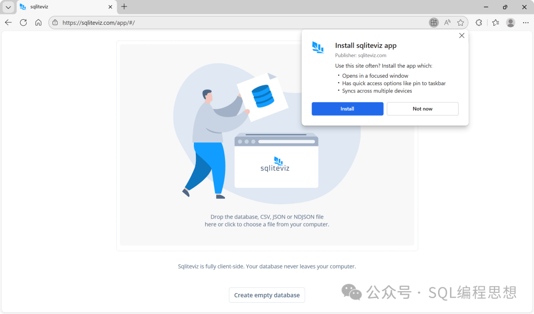 如果想要以桌面应用的方式运行 Sqliteviz,可以在网页版应用之后,点击地址栏右侧的“Install”按钮即可。