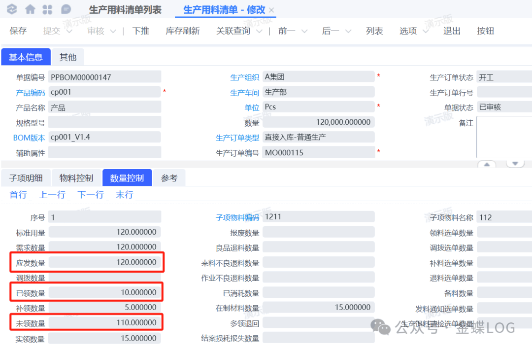 ①生产领料单发的是计划内的需求,也就是用料清单的应发数量;领料单在审核之后会反写用料清单的【已领数量】字段,并且会扣减【未领数量】字段