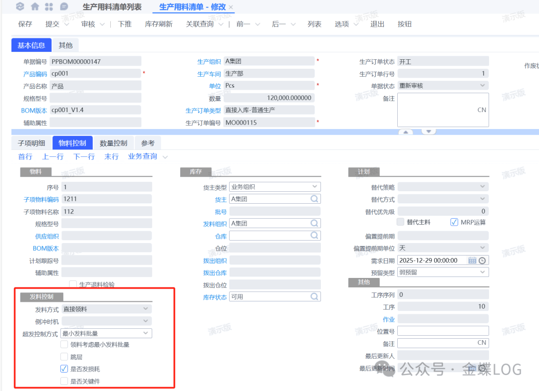 ②生产领料单下推出来的数量会受生产用料清单【发料控制】下的参数影响,而补料单不会。