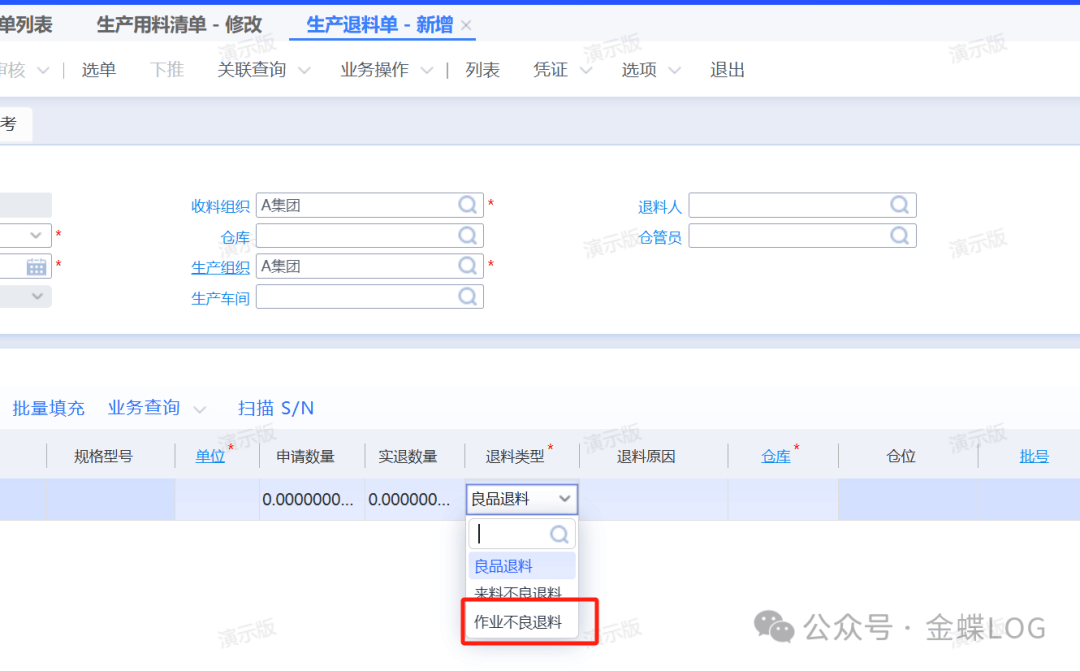③在生产退料之后,是做领料单还是补料单也有区分。主要看退料单上的【退料类型】选的是什么
