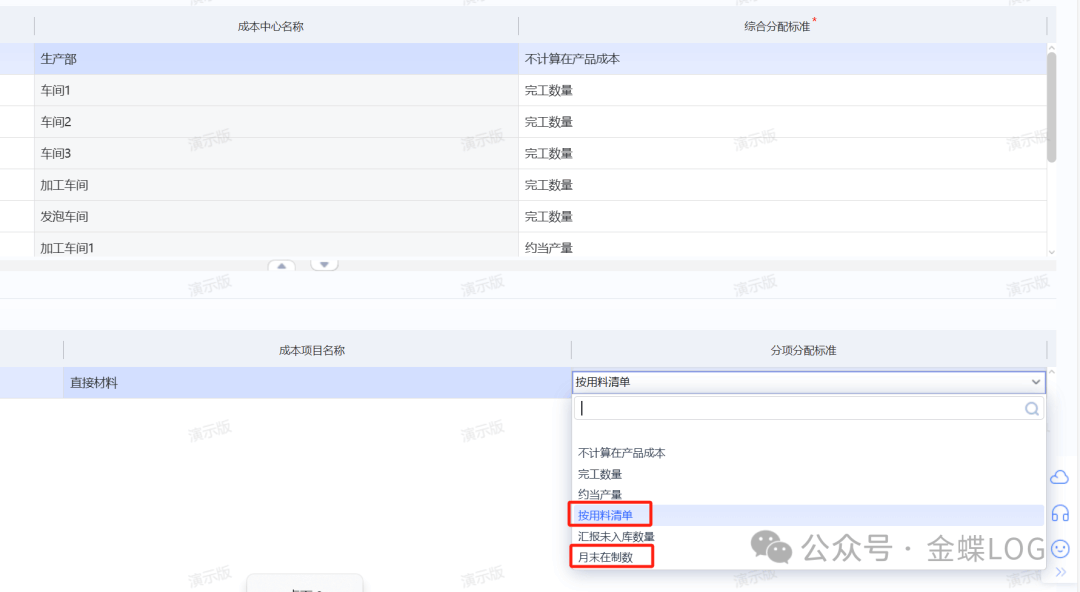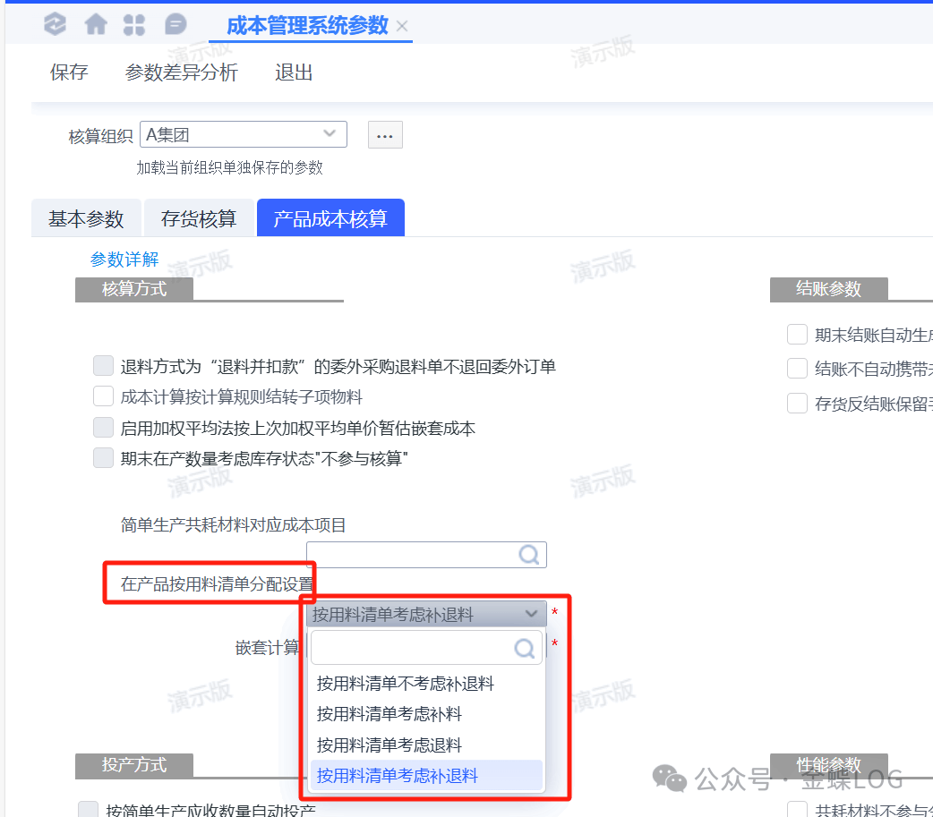 如果你的在产品分配标准下的直接材料选的是【按用料清单】或者是【月末在制数】,那你可以对【是否考虑补退料】进行设置。