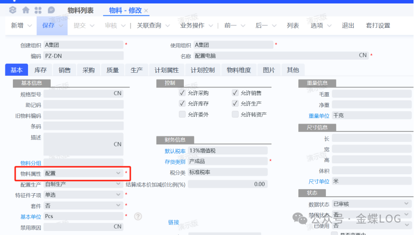 那这种产品的BOM,我们要怎样在系统上创建? 第一步:新增【配置】类的产品料号 也就是上面表格第一层的配置电脑。 新增物料的时候,将其“物料属性”选择为【配置类】。