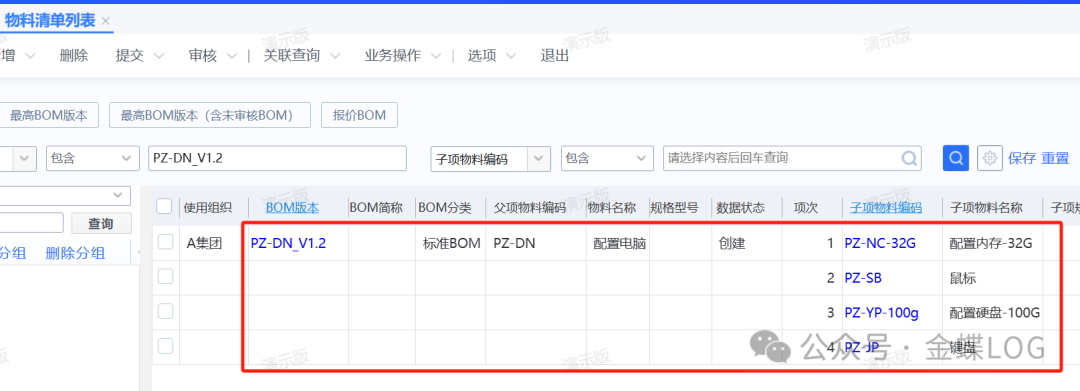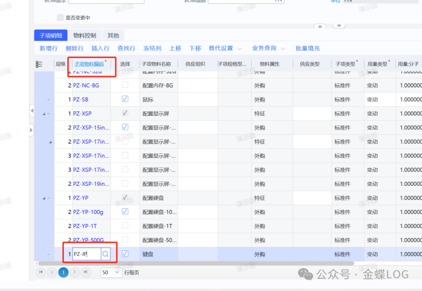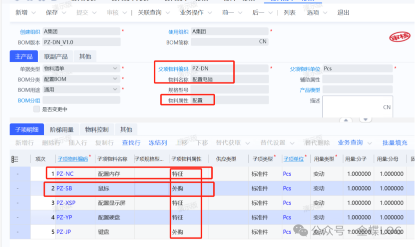 第五步:给【配置】件料号创建BOM 新增物料清单时,父项料号选择第一步创建的配置物料,子项可以包含:特征件和外购件或自制件;这里额外加上了两个直接外购的鼠标和键盘物品,它俩不需要选配。