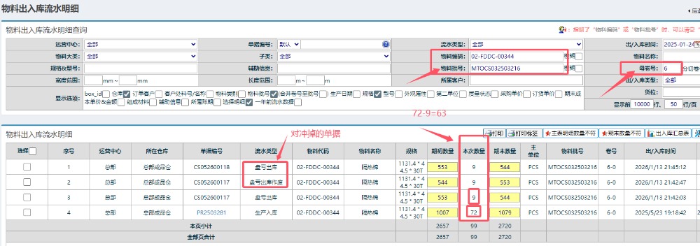 :点晴模切ERP利用出入库流水数据分析库存是否正确![]() 经常有客户提出问题,说系统库存表的库存与实物不符。如果遇到这种情况,可以利用出入库流水数据分析库存是否正确。 以料号:02-FDDC-00336这个物料为例:批号MTOCS032503216,卷号6,当前数量63