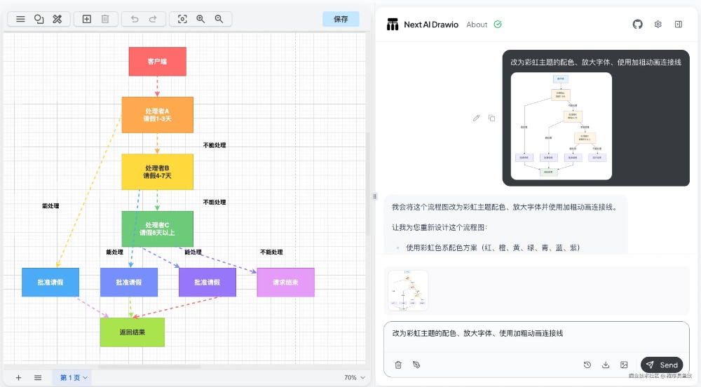 然后你可以利用 Draw.io 自身强大的绘图能力手动修改任意元素、或者是改变风格样式。 也可以通过 AI 对话让它帮你修改,比如改成动画连接线,逼格一下子就上来了。