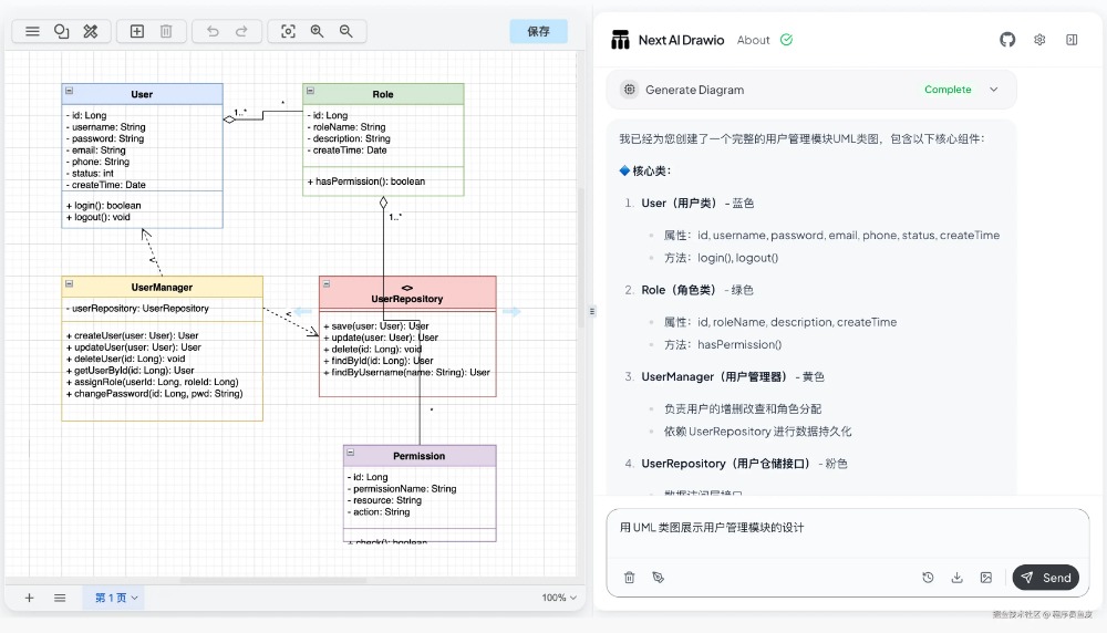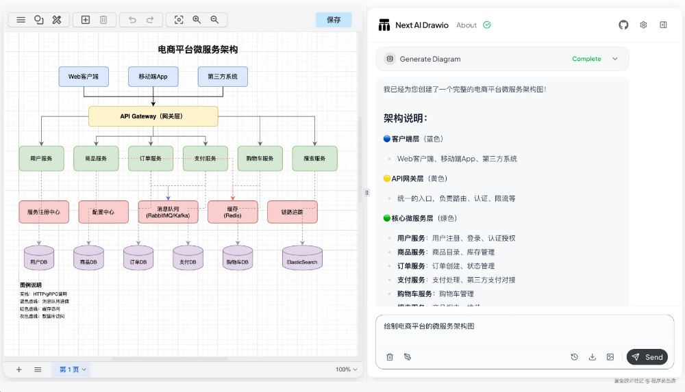 最后多说两句,这个项目的实现其实并不复杂。作者通过集成 Vercel AI SDK 轻松对接各种大模型,让 AI 生成 draw.io 能理解的 XML 代码。 然后直接使用开源的 draw.io 代码实现了核心的绘图展示和编辑能力,整个过程和 AI 生成网站是类似的。