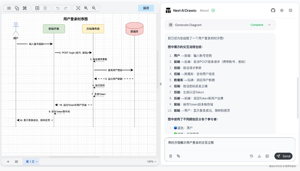 这个项目支持在线体验,你可以完全从 0 开始画图,比如画一个流程图,演示 RAG 的工作原理。 ⭐️ 建议观看视频演示:bilibili.com/video/BV18N… AI 会自动生成 Draw.io 绘图代码,很快精美的流程图就搞定了!