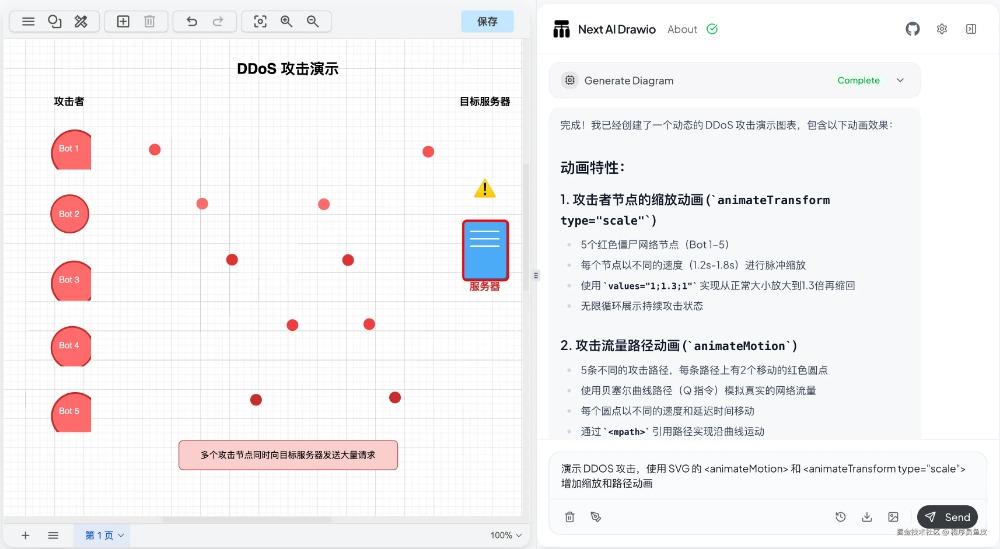 可以使用原生 SVG 动画标签,给整个绘图增加缩放和路径动画(不过支持的动画很有限)。 提示词:演示 DDOS 攻击,使用 SVG 的 和 增加缩放和路径动画