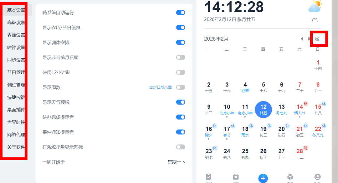 4、点击设置按钮,可以设置是否开机运行,是否显示农历、节日等信息。