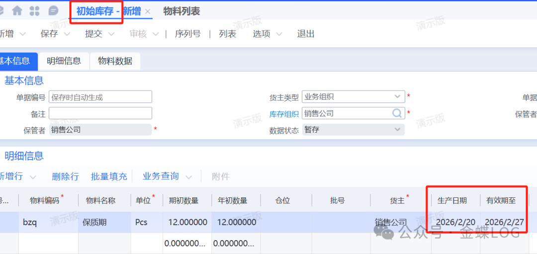 ![]() 一旦物料被使用(有库存或发生过业务),不允许再启用或关闭保质期管理,否则会导致库存数据混乱。 三、物料启用保质期后的业务处理1. 库存初始化在初始化库存数量时,必须录入启用保质期物料的生产日期和有效期至信息,作为库存的维度之一。 ![]() 2. 日常出入库