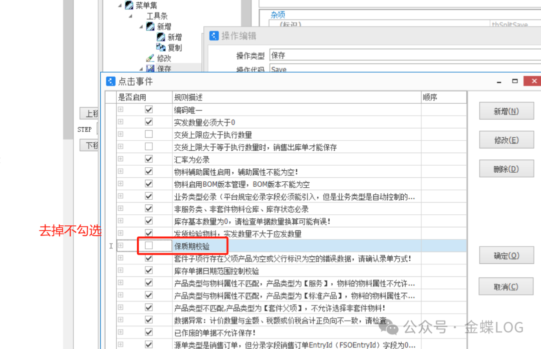 ①若物料仍可降级使用或报废,可通过其他出库单办理出库(不计入销售)。 ![]() ②若因复检合格需要延长有效期,可通过批号调整单修改有效期至,调整后可恢复正常出库。 ![]() ③若销售出库单一定要出过期物料,可以在BOS平台保存按钮放开保质期校验。 ![]() 五、批号与保质期的关系如果物料同时启用批号管理和保质期管理,系统提供了一个重要关联字段——【批号附属信息】,它决定了批号与保质期的绑定关系。 情况一:不勾选【批号附属信息】