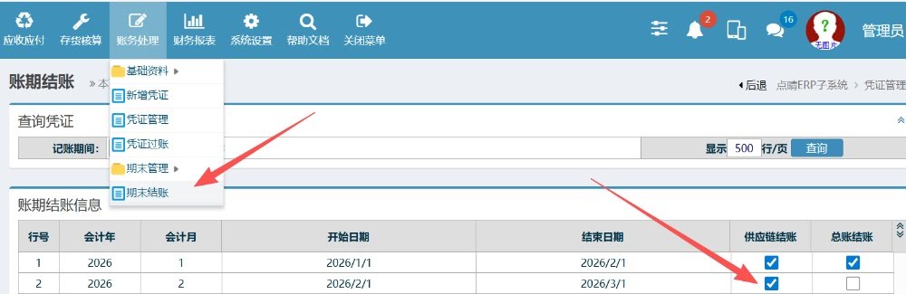 操作步骤:进入FMS财务模块-账务处理-期末结账,进入界面后,可操作对应月份区间结账反结账操作,打勾属于结账操作,取消打勾则为反结账操作