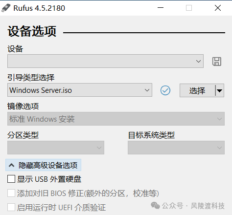 下方引导类型选择 “镜像文件”,点击选择,载入刚才下载好的 Windows Server 镜像;