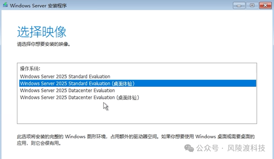 3.选择 “全新安装”,勾选同意条款协议,下一步后会看到系统版本选项,分标准版和数据中心版,重点:不管选哪个版本,一定要选带 “桌面体验” 的,否则没有 UI 界面,适合服务器使用,个人用必选桌面体验版,我选的是第四个数据中心版桌面体验;
