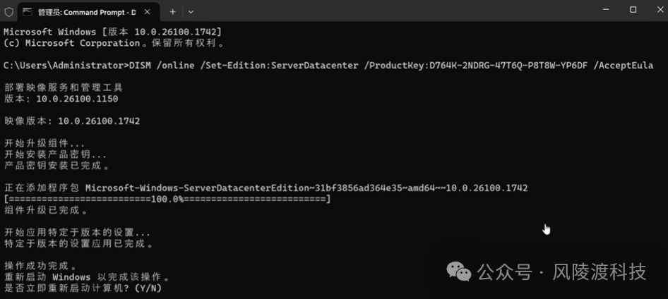 3.把转正命令复制粘贴到 CMD 中,将命令里的占位符替换为官方获取的真实密钥,按下回车,系统会开始升级组件、添加程序包,这个过程大概两分钟,等待完成后按提示重启电脑即可。