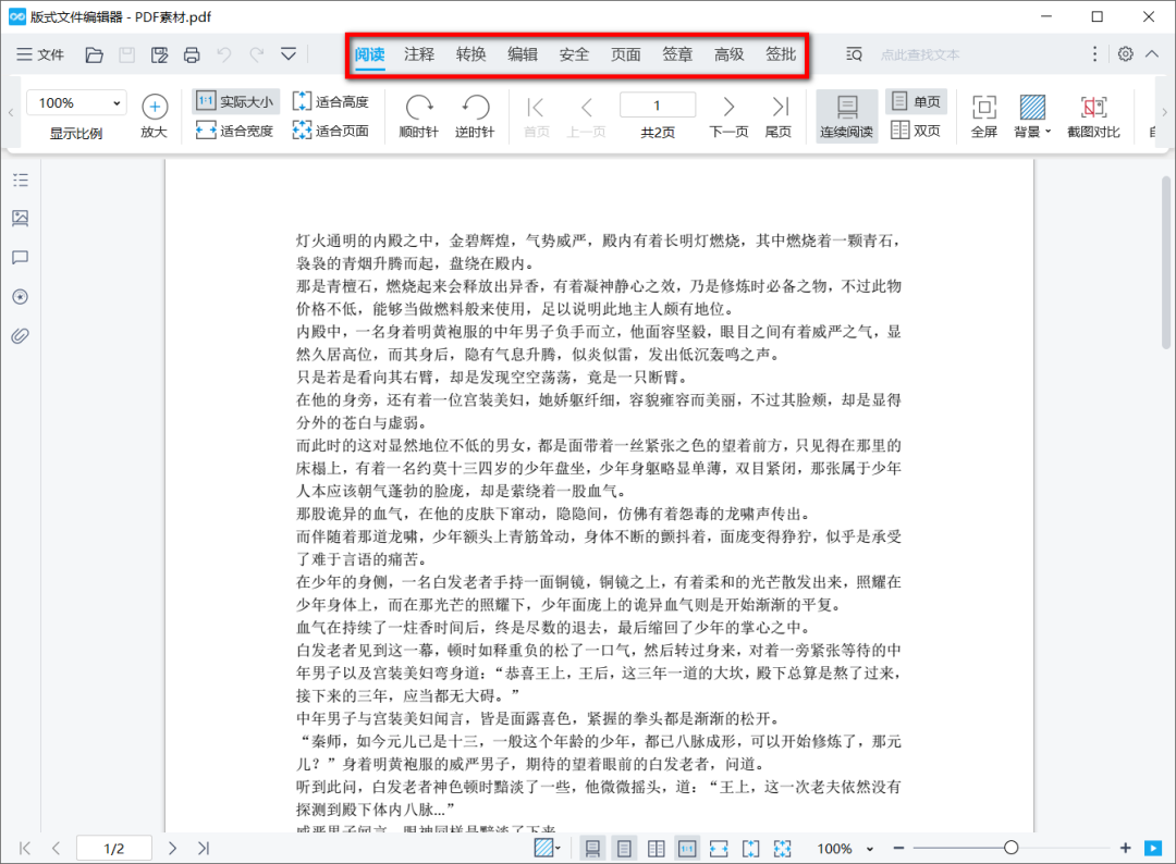软件支持拖入添加文件,提供阅读、注释、转换、编辑、安全、页面、签章、高级和签批功能。