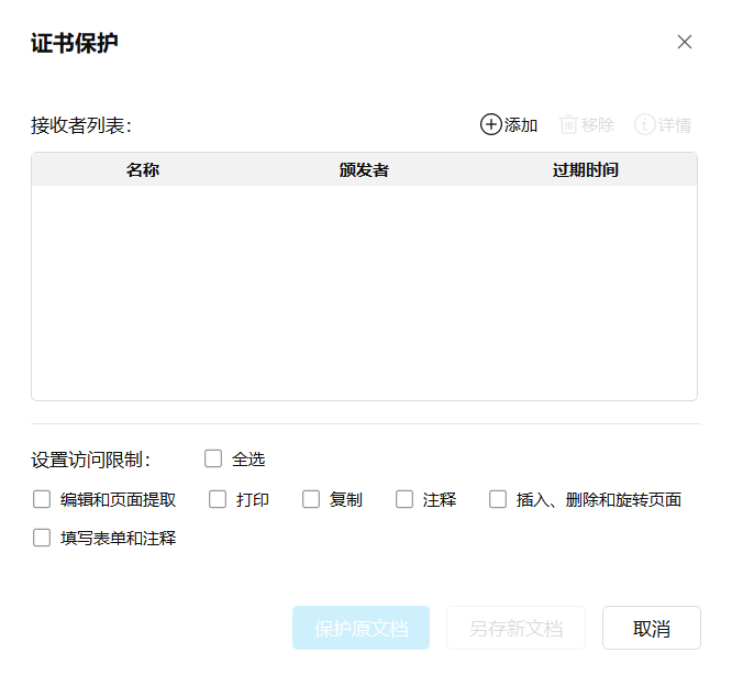 安全:支持添加证书保护和文档保护,支持管理打印、复制、注释和编辑等权限。