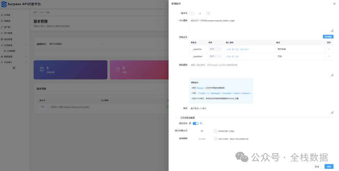 虽然“SQL 转 API”是最大亮点,但 Surpass 的真正价值在于构建了一套完整的 API 生命周期治理体系。