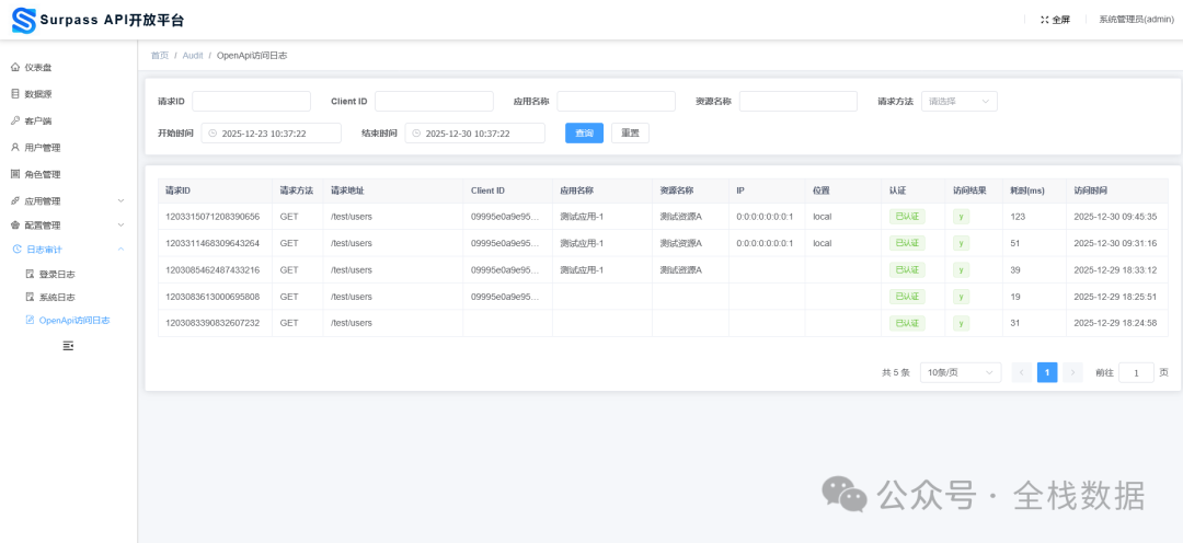 Surpass 提供详细的 API 调用日志面板,支持按时间、用户、客户端、接口路径等维度筛选,便于问题排查与安全审计。