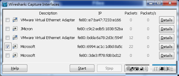 点击Caputre->Interfaces.. 将会呈现一个对话框,请挑选合适的网络适配器。然后点击"Start"按钮, 开始抓包