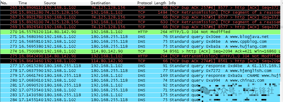 在数据包列表的面板区域中展示,编号,时间戳,源地址,目标地址,协议,长度,以及数据包的具体内容。 您能够观察到,不同的协议是通过使用不同的颜色来进行区分和展示的。
