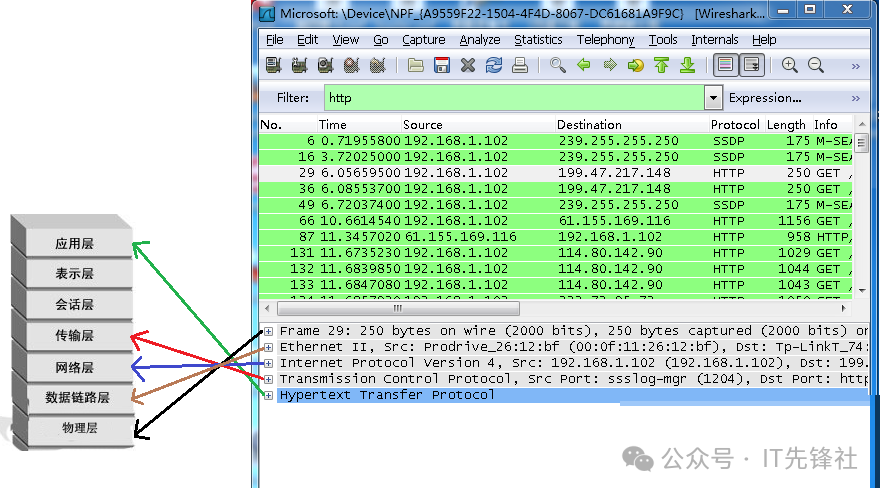比如 ip.src ==192.168.1.102 标示出源头地址为192.168.1.102,