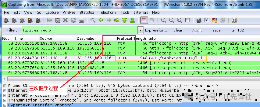 图中可以看到wireshark截获到了三次握手的三个数据包。第四个包才是HTTP的, 这说明HTTP的确是使用TCP建立连接的。