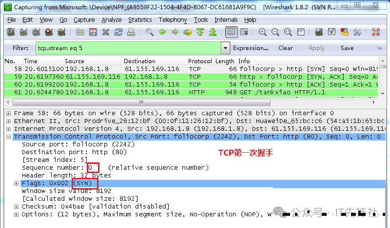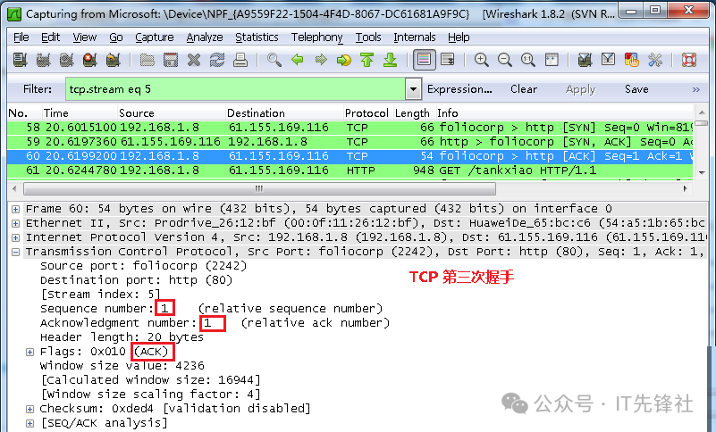看到这, 基本上对wireshak有了初步了解, 现在我们看一个TCP三次握手的实例