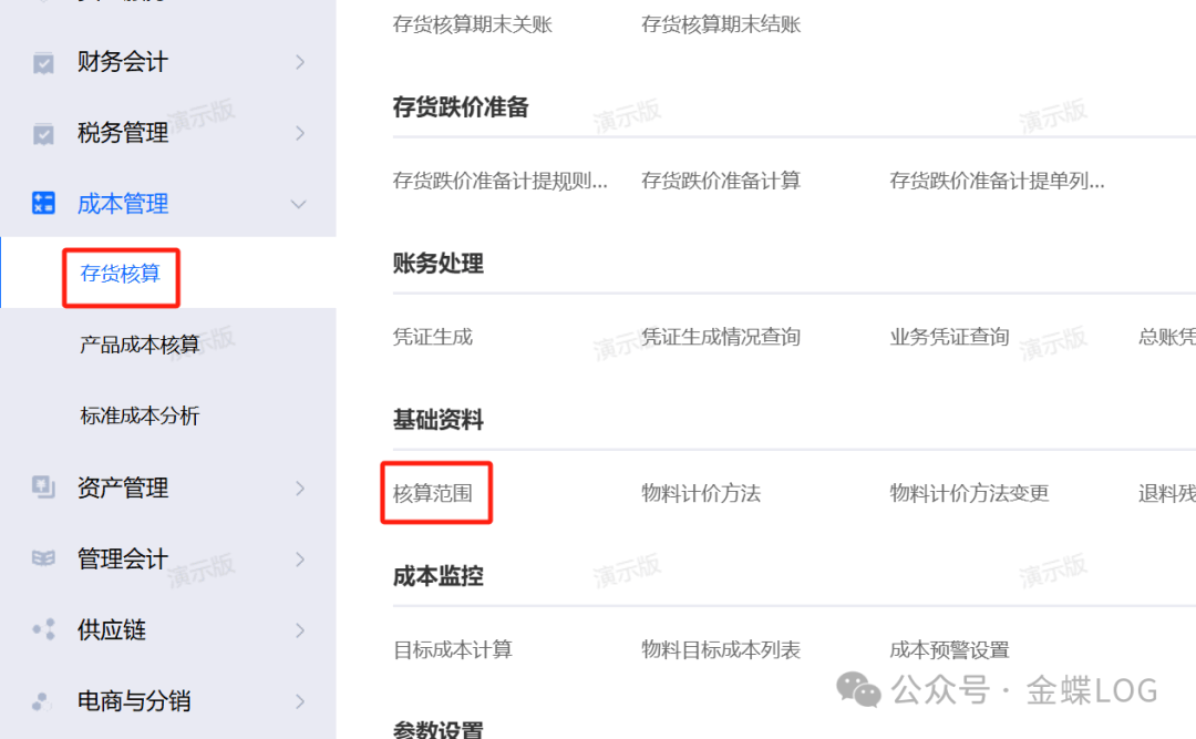 注:核算范围的作用后面再做介绍;存货一旦结账后,核算范围就不能再进行反审核删除了。