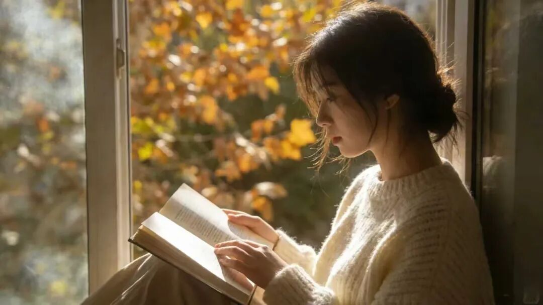 主体是穿米白毛衣的女孩坐在窗边,阳光斜照在书页上,窗外梧桐叶轻摇。