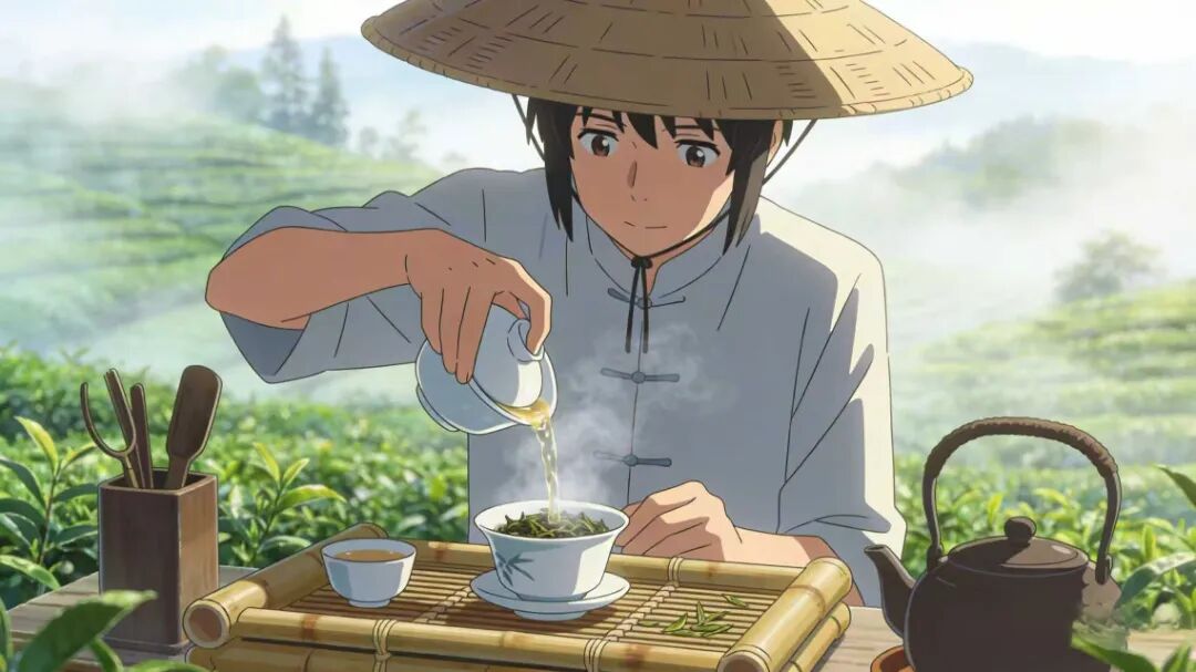 主体是戴斗笠的茶人,在晨雾茶园中冲泡乌龙茶,竹制茶盘上水汽氤氲。
