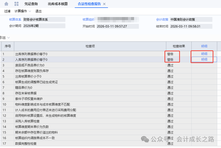 根据明细处理,存货核算期末关账-反关账,处理完上图问题再关账。重新做出库核算,查看合法性检查报告,检查警告项对应明细,如果是供应商免费赠品导致单价等于0,忽略。
