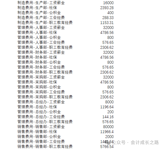 根据产量统计表、工时统计表计算当月应发工资,并计提相应的工会经费、职工教育经费和社保等,按生产部门计算归集人工成本,按费用分配标准分摊计入“生产成本-直接人工”。