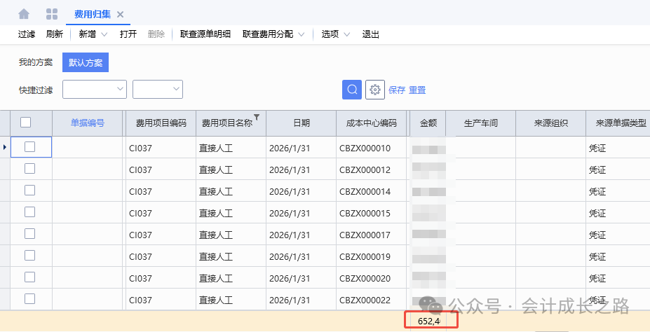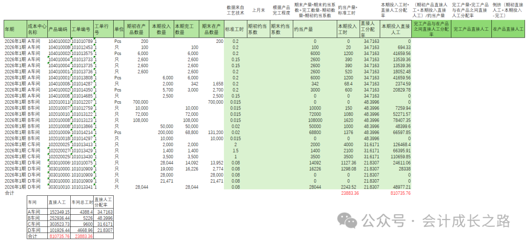 贷:银行存款-**银行(直接支付)/应付账款(从采购商过账)/其他应付款(员工报销)5、当月相关凭证完成后,达到成本核算条件并开始成本核算时结转直接人工到生产成本-直接人工 生产成本-直接人工-B车间贷:直接人工-A车间-工资薪金/社保/公积金/工会经费/职工教育经费/福利费等 直接人工-B车间-工资薪金/社保/公积金/工会经费/职工教育经费/福利费等 直接人工-C车间-工资薪金/社保/公积金/工会经费/职工教育经费/福利费等 直接人工-D车间-工资薪金/社保/公积金/工会经费/职工教育经费/福利费等2、科目余额表“生产成本-直接人工”本期发生额合计数与费用归集中直接人工金额一致,代表分配完成。3、以标准工时分配标准为例(从成本中心分配到产品)由于期末各工单生产进度不一致,很难预估约当系数,约当产量对生产管理的水平要求较高,一般企业不适用这种方式。故此例在产品不分摊直接人工,由完工产品全额承担。此示例仅作为直接人工分摊逻辑展示,使用ERP的企业,只要成本模块上线时基础设置好,在第2步费用引入核对正确,成本计算完,系统会自动分配。以下数据非真实。直接人工分配率=直接人工(取自科目余额表"生产成本-直接人工"本期发生额)/各车间总工时如果企业管理较好,适用约当产量法在完工成品和在产品之间分摊直接人工和制造费用,需要设置约当系数和在产品分配标准设置。