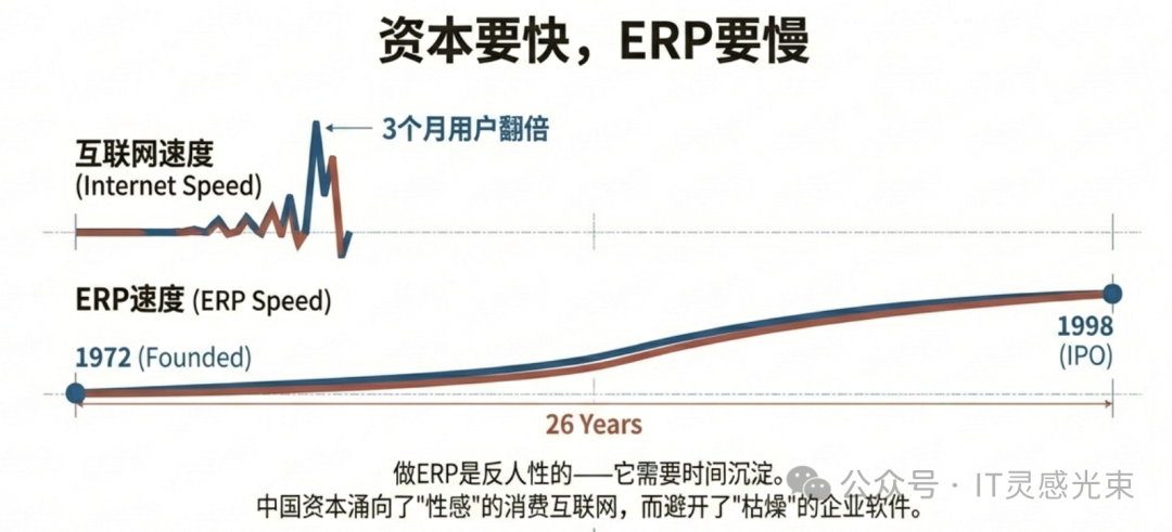 ERP的增长逻辑完全不符合这套叙事——它客户获取慢、实施周期长、口碑积累难,短期内很难给出漂亮的增长曲线
