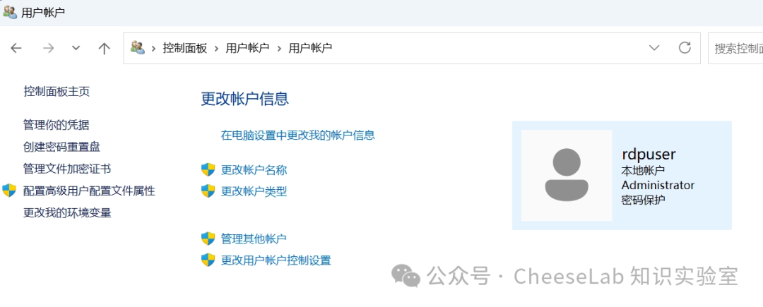 打开 “控制面板” > “用户账户”,如果是本地账户,不需要进行下面操作