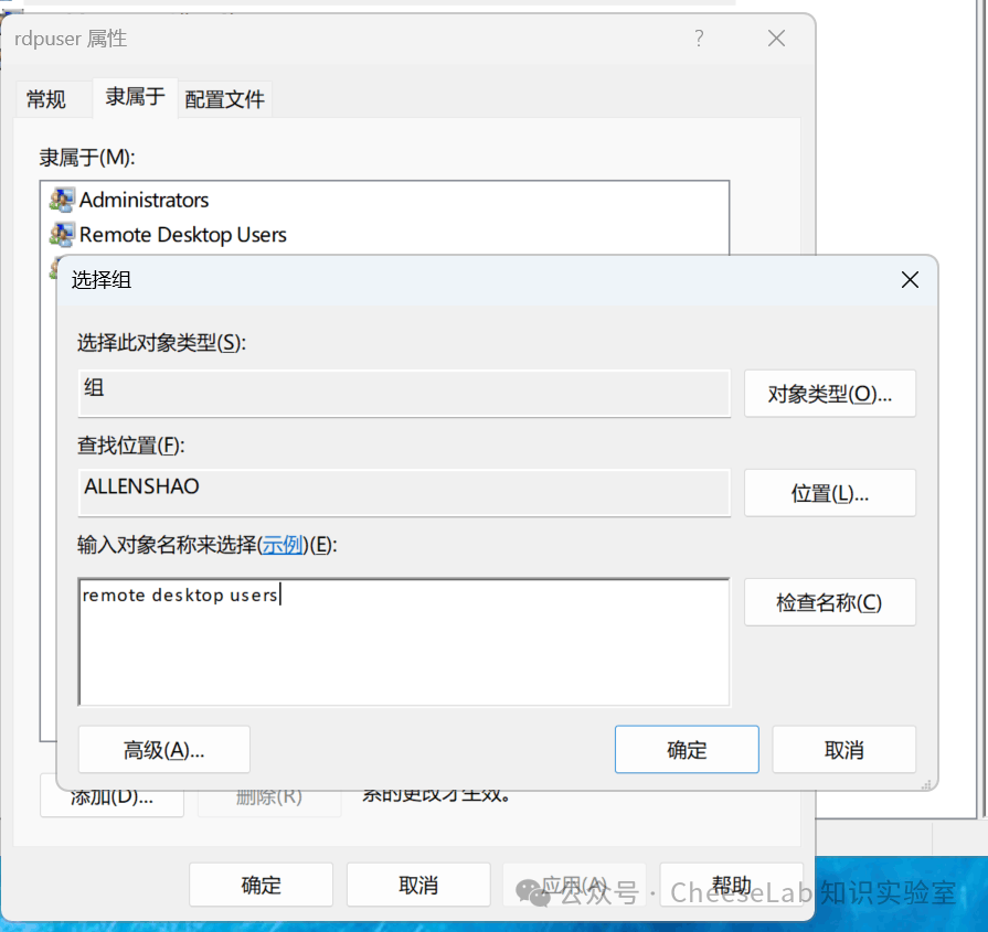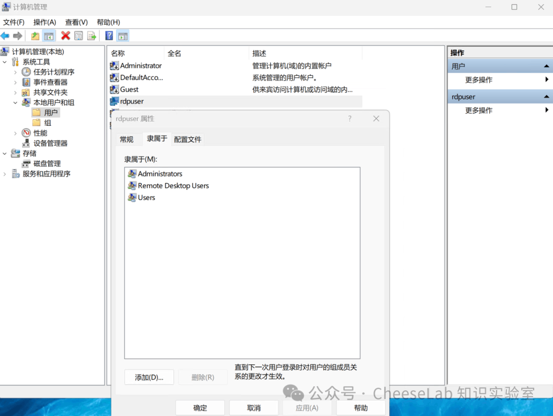 确保该账户隶属于 Remote Desktop Users 组,以获得远程连接权限。