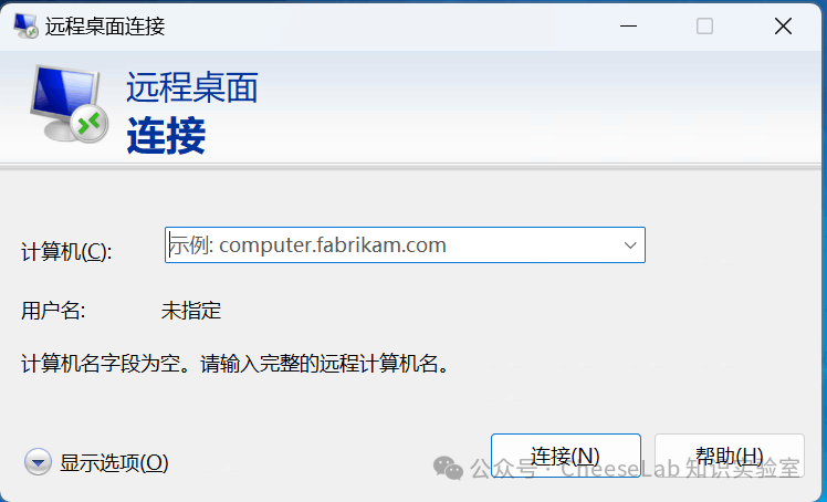 在本地计算机上,按 Win+R 打开 运行窗口,输入 mstsc 并点击 回车,启动远程桌面连接。