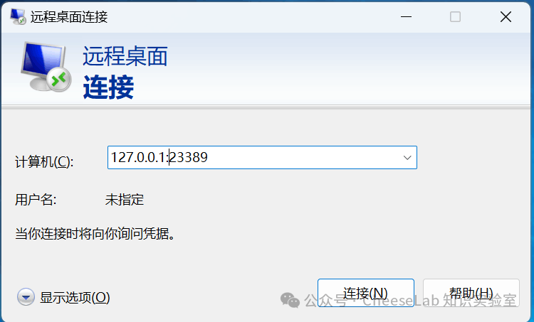 在远程桌面连接界面,输入远程IP地址,此时IP填的内容是Openp2p设置的,下图所示本地电脑的端口是23389,目标电脑是办公电脑,此时输入IP:127.0.0.1:23389(或localhost:23389),点击连接