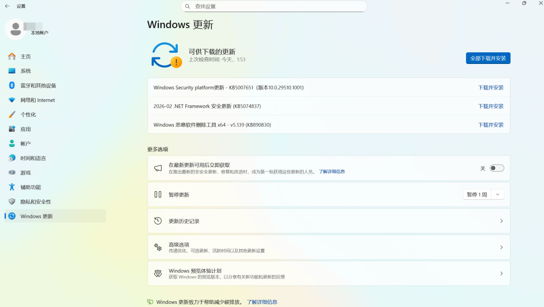 运行软件后,Windows更新界面会迅速弹出。从界面中可以清晰看到,电脑原本是有待更新的内容的。