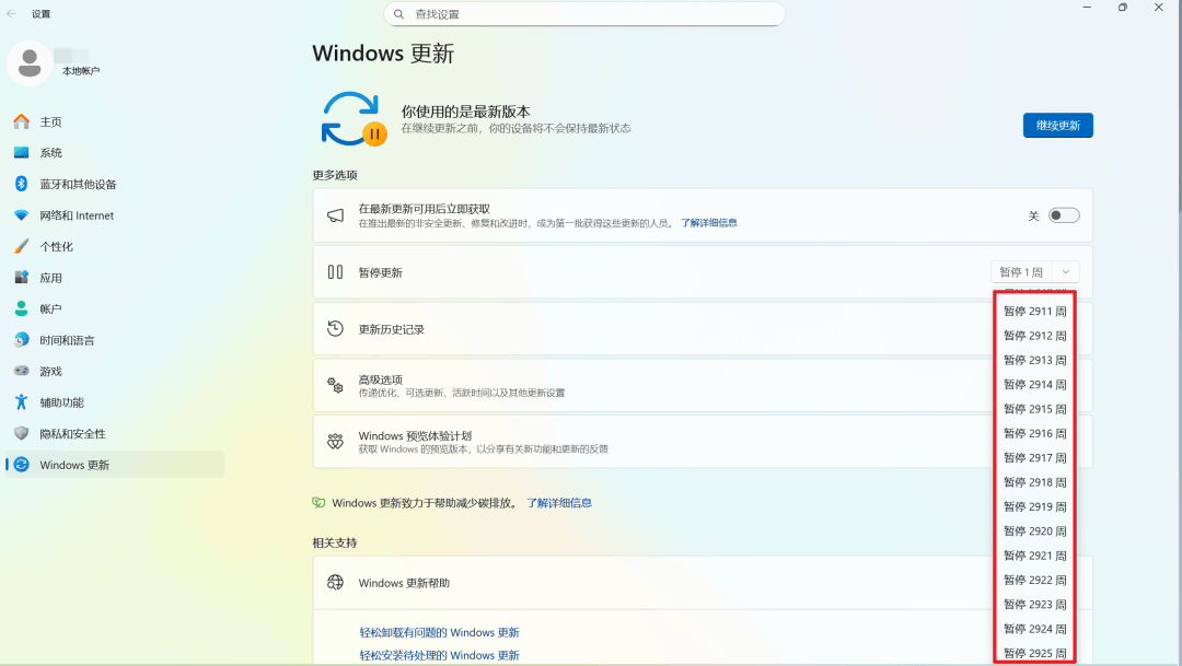 当运用软件的暂停更新功能后,在暂停更新的设置选项里,最高能够暂停2925周,算下来大约是56年,这几乎等同于永久性暂停更新了。